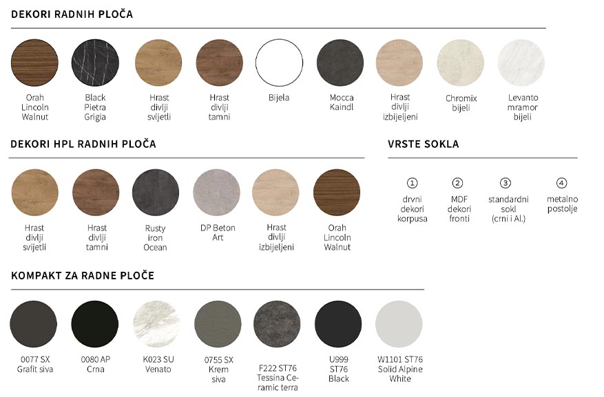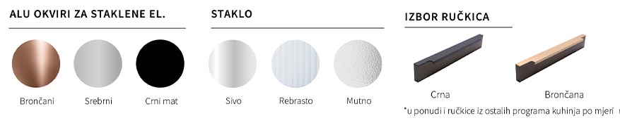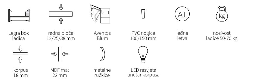 metalne ručkice 5 godina garancije na Titus okove 10 godina garancije na Blum okove mogućnost odabira kompakt ili klasičnih radnih ploča mogućnost odabira i ugradnje rasvjete dubina kuhinje i radne ploče 60 cm 5 godina garancije na drveni dio kuhinje