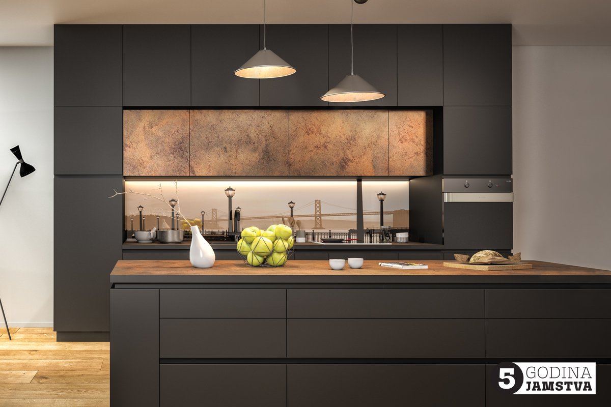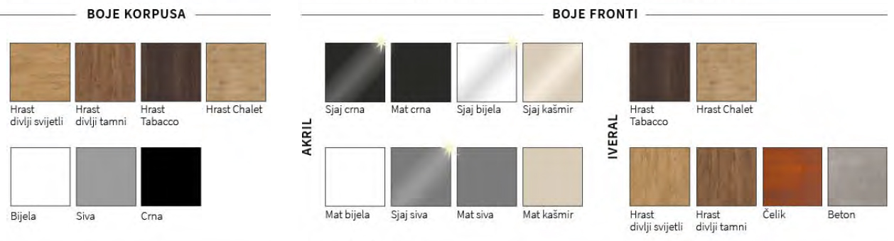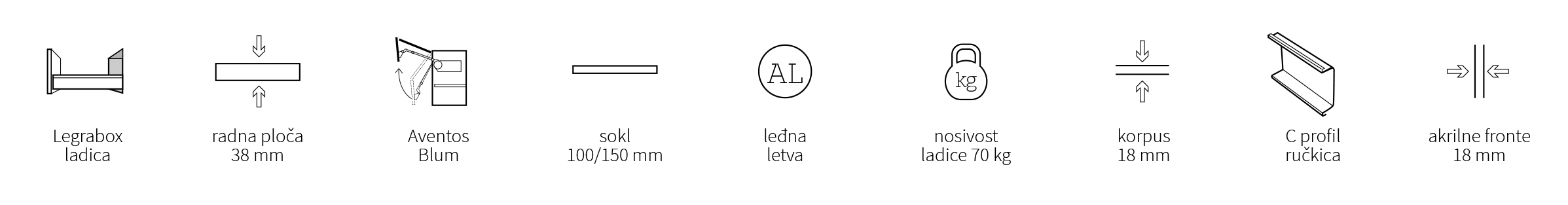 • fronte bez ručkica (tip-on i C profil) • 5 godina garancije na Titus okove • 10 godina garancije na Blum okove • mogućnost odabira kompakt ili klasičnih radnih ploča • mogućnost odabira i ugradnje rasvjete • mogućnost odabira fronte u oplemenjenom iveralu (drvni iverali i ostalo) • dubina kuhinje i radne ploče 70 cm • dvije dubine gornjih elemenata