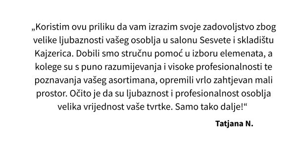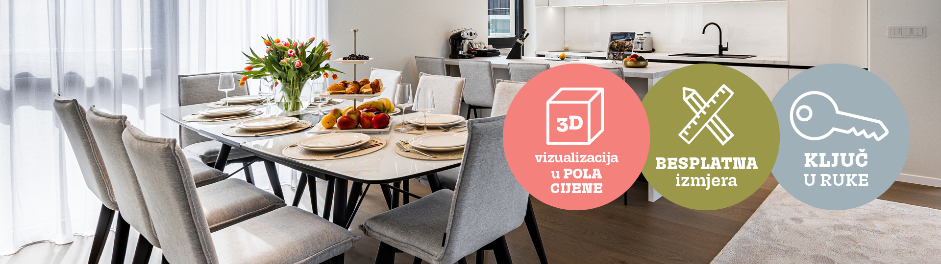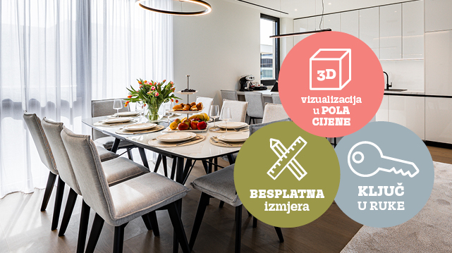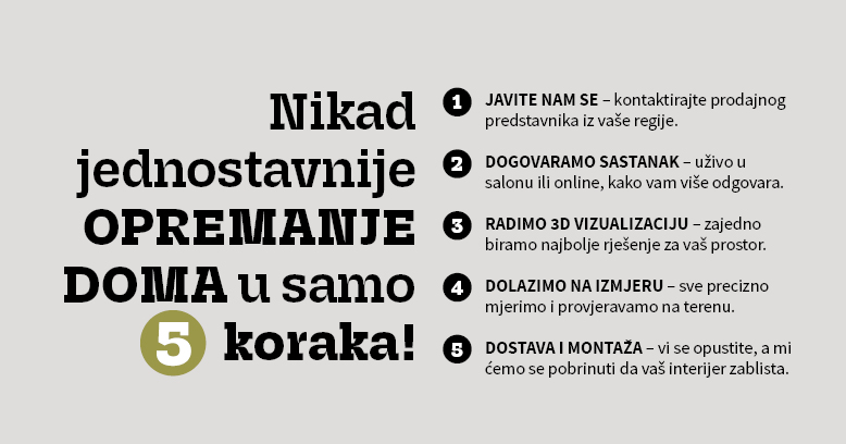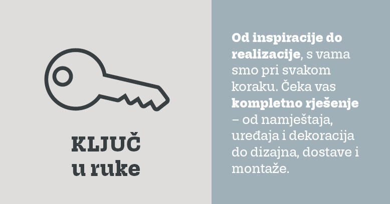 Od ideje do useljenja – opremanje interijera nikad nije bilo jednostavnije. Kod nas na jednom mjestu možete opremiti baš svaku prostoriju svog doma – brzo, jednostavno, povoljno i, najbitnije, bez stresa. Mi vam dajemo – ključ u ruke! Osmislili smo programe namještaja kako bi se isti stil, boje i materijali protezali kroz cijeli interijer. Prostorije ćemo oplemeniti uređajima i dekoracijama, a uz izmjeru, dostavu i montažu preostaje vam samo da uživate jer mi ćemo se pobrinuti za sve ostalo.