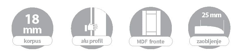 Vrata su izrađena od MDF ploča, materijala poznatog po iznimnoj čvrstoći, glatkoj površini i mogućnosti precizne obrade koja pruža savršenu završnicu. Korpus ormara izrađen je od iverice debljine 18 mm, što osigurava stabilnost, dugotrajnost i otpornost na svakodnevno korištenje. Kombinacija ovih materijala jamči visoku kvalitetu i elegantan izgled koji traje.