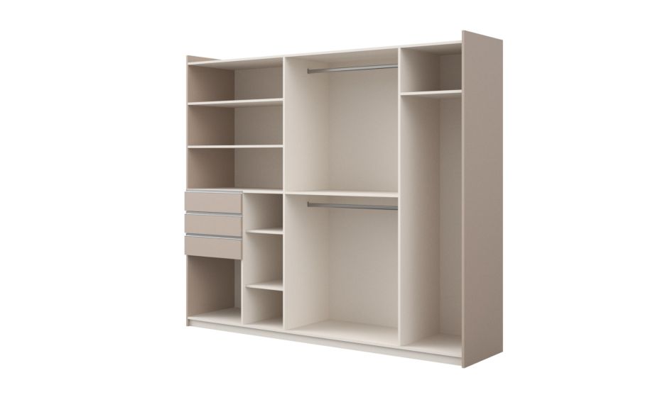 Inovativan dizajn kliznih vrata s vanjskim ladicama – posebnost i velika novost u dizajnu kliznih ormara su vanjske ladice, kojima možete jednostavno i neometano pristupiti, ovisno o dimenzijama modela ormara, birajte 3 ili 6 ladica s elegantnim Metabox sustavom i usporivačem za tiho zatvaranje.
