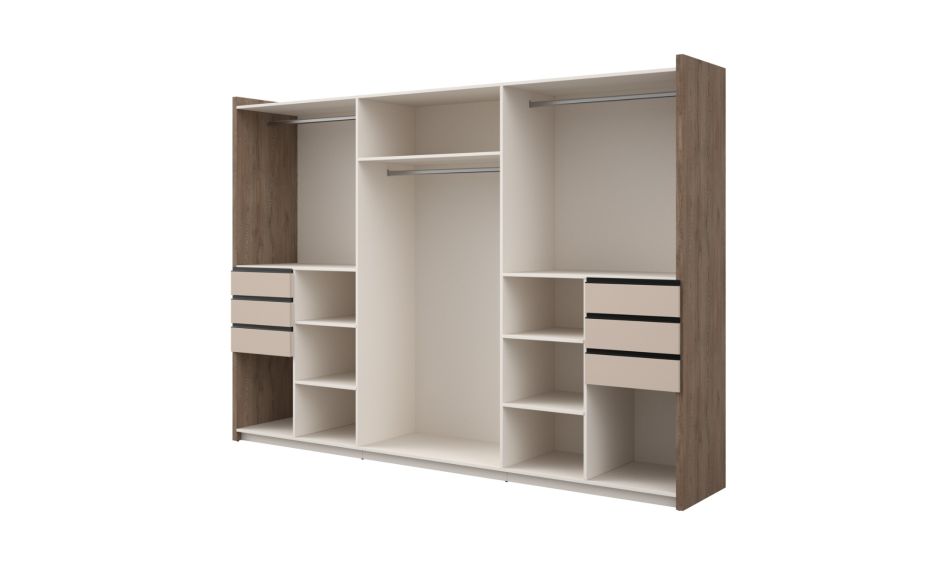 Inovativan dizajn kliznih vrata s vanjskim ladicama – posebnost i velika novost u dizajnu kliznih ormara su vanjske ladice, kojima možete jednostavno i neometano pristupiti, ovisno o dimenzijama modela ormara, birajte 3 ili 6 ladica s elegantnim Metabox sustavom i usporivačem za tiho zatvaranje.