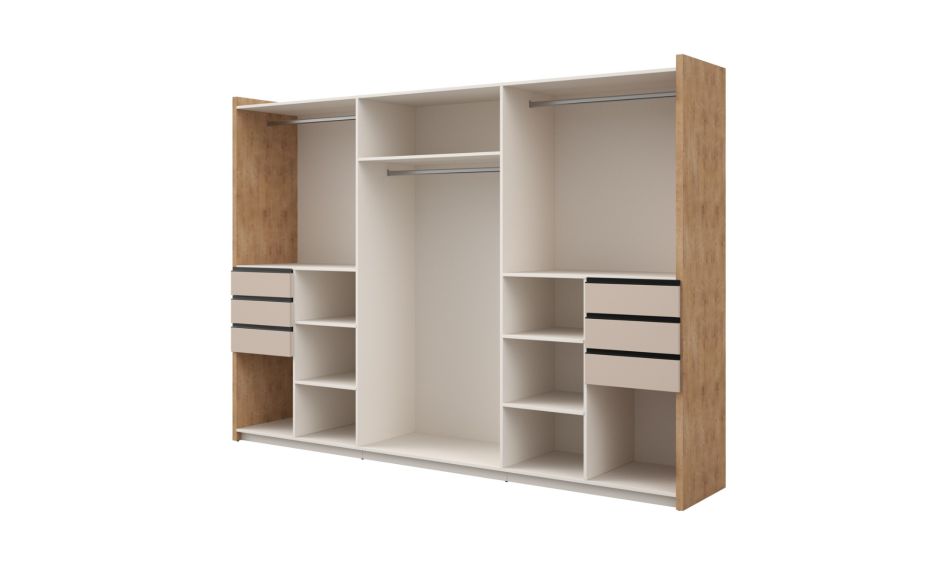 Inovativan dizajn kliznih vrata s vanjskim ladicama – posebnost i velika novost u dizajnu kliznih ormara su vanjske ladice, kojima možete jednostavno i neometano pristupiti, ovisno o dimenzijama modela ormara, birajte 3 ili 6 ladica s elegantnim Metabox sustavom i usporivačem za tiho zatvaranje.
