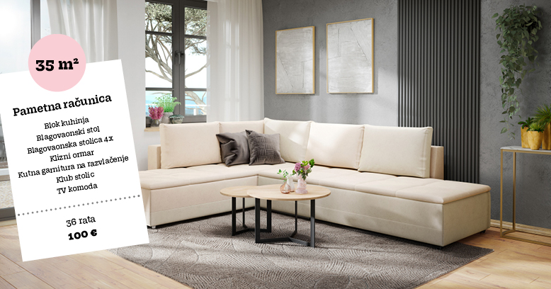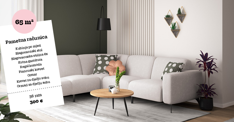 Prvi stan? Nema brige! Sve riješi na jednom mjestu – namještaj, uređaje, dekoracije… Napravit ćemo 3D plan i onda krećemo u akciju – na izmjeru, dostavu i montažu.