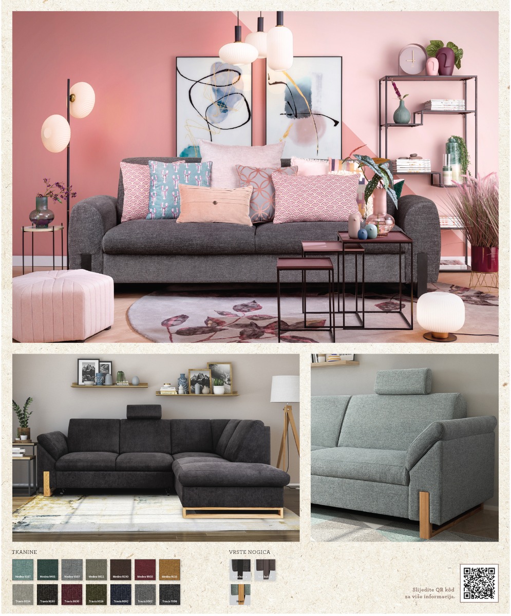 Catania premium program garnitura posjeduje atraktivan i funkcionalan dizajn koji čini ove garniture poželjnima i uklopivim u svaki životni prostor. Kombiniranjem elemenata, garnitura se prilagođava prostoru, a ovisno o željama i stilu uređenja slijedi odabir boje tkanine i dekora efektnih drvenih nogica. Dvostruki sloj kvalitetne HR pjene položen na val opruge jamči iznimnu udobnost, dugotrajnost i postojanost oblika. .