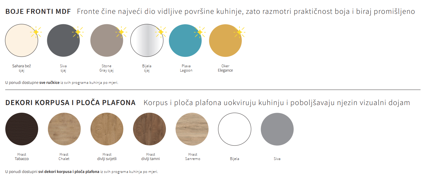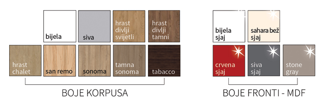 MDF fronte u sjaj izvedbi dostupne su u širokoj paleti boja, a mogu se prilagoditi svakom prostoru i željama. Uz velik broj fronta raznih boja i završne obrade, možete izabrati i ugrađenu rasvjetu, vrstu ručkica, kompakt ili klasične radne ploče.