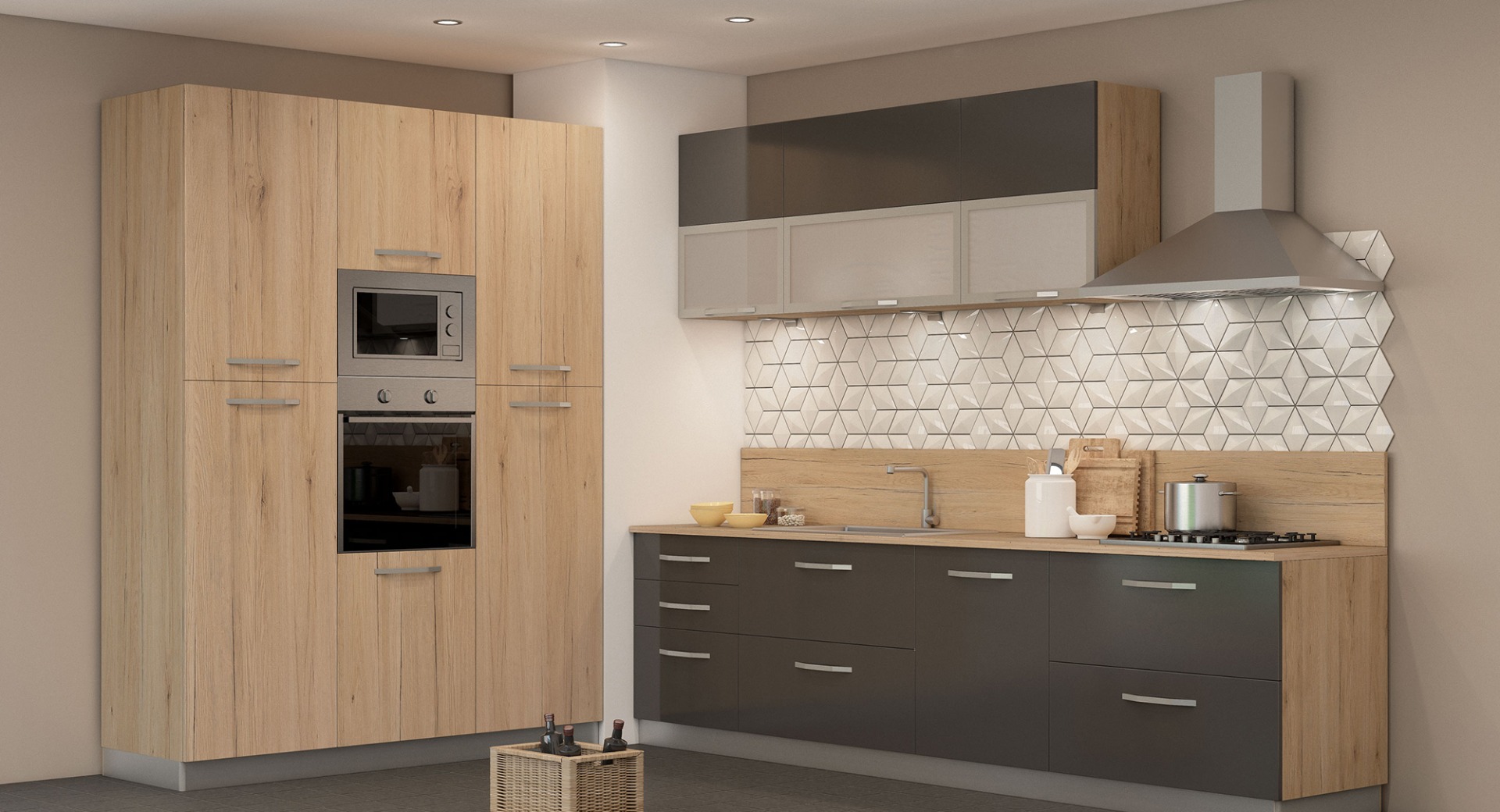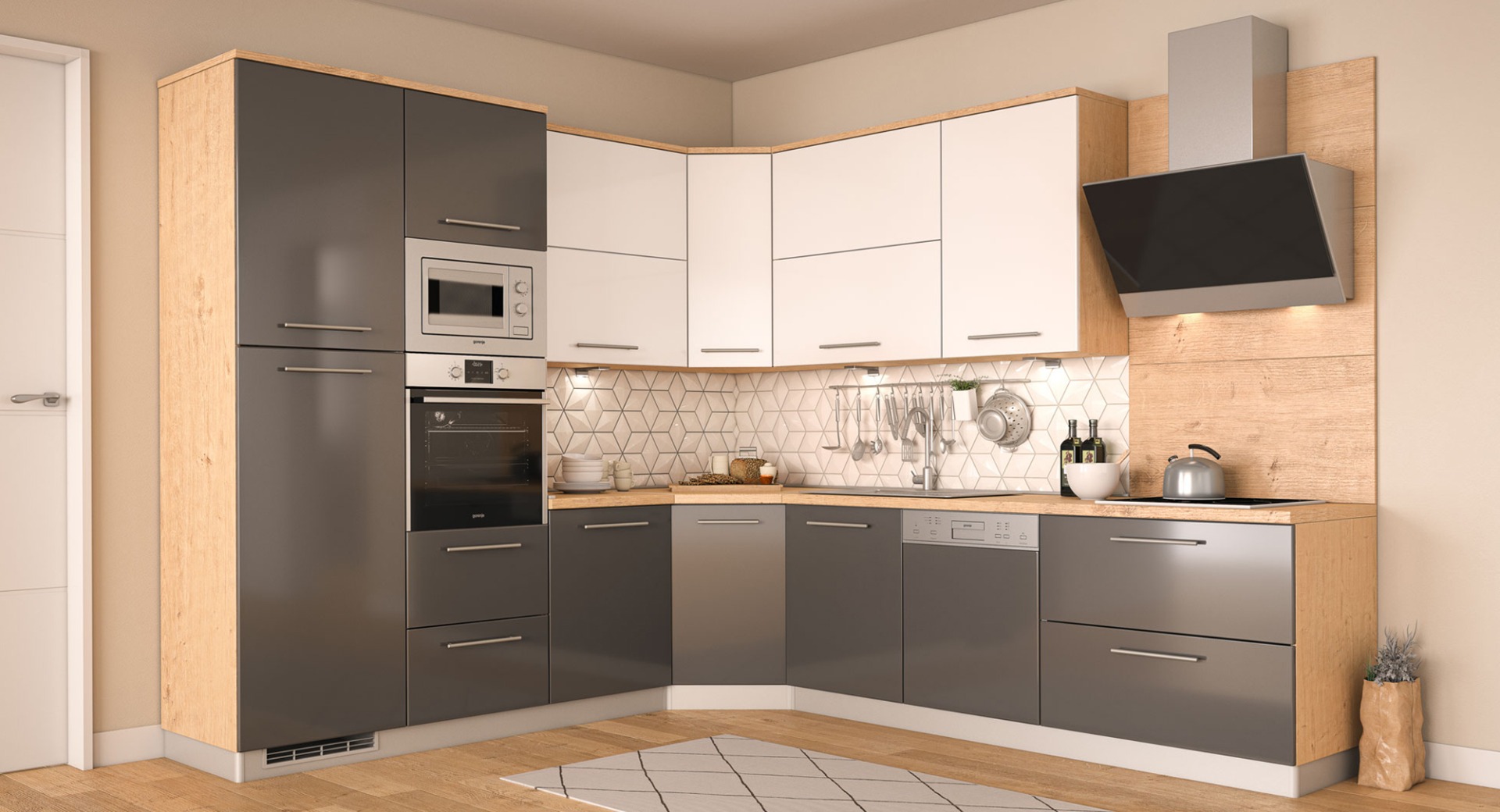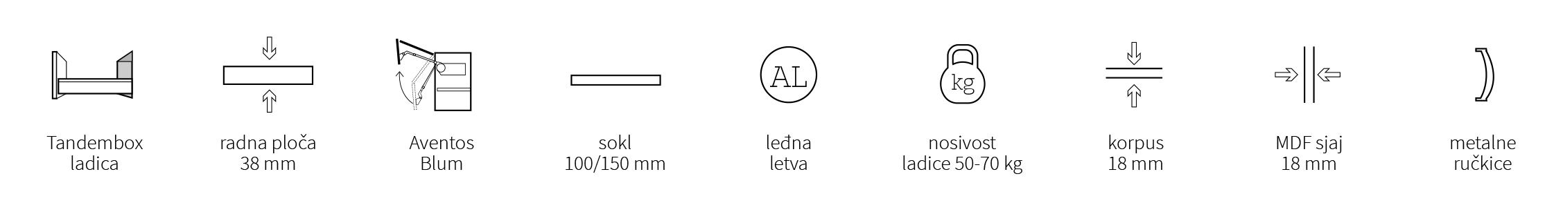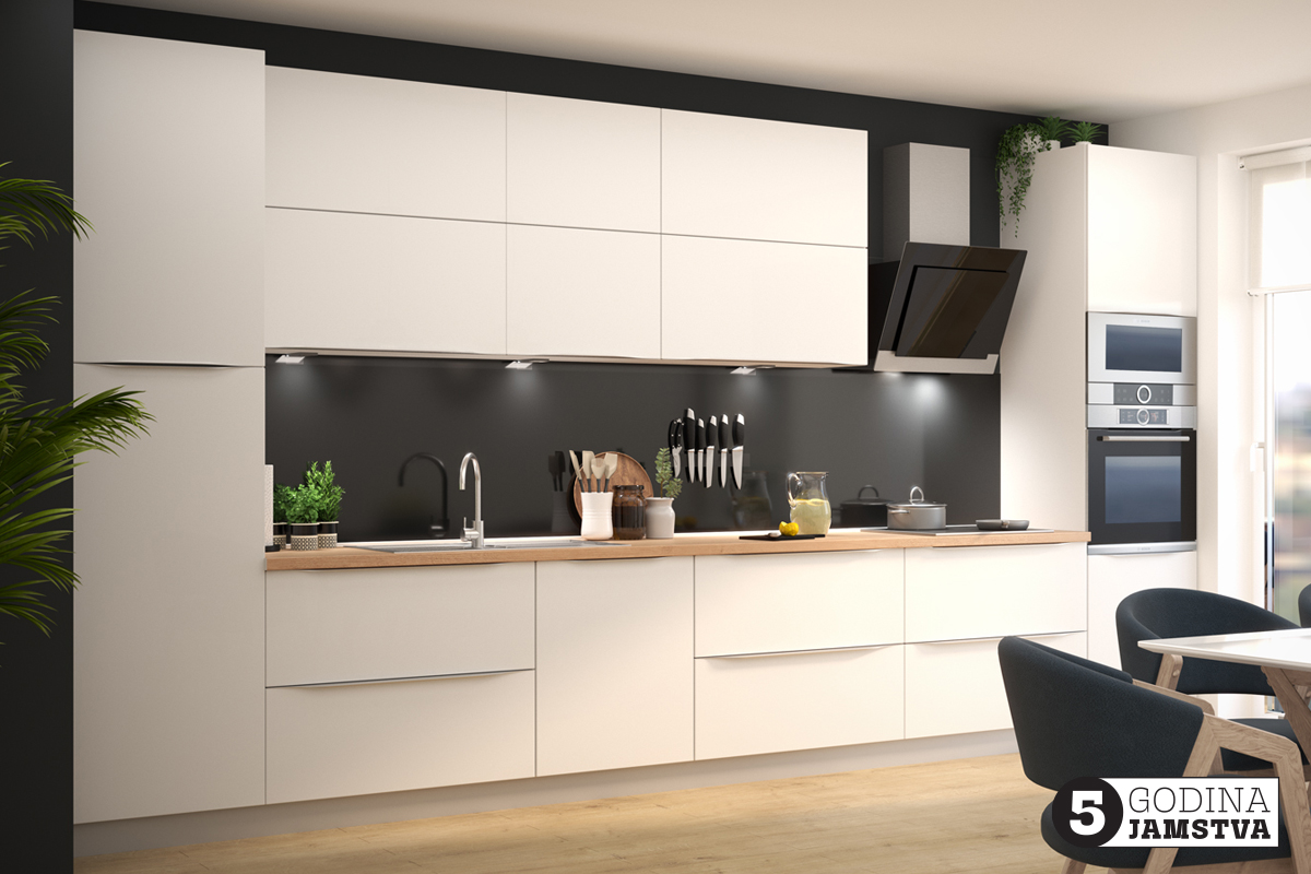 • usporivači vrata i ladica za bešumno zatvaranje uključeni u elemente • 5 godina garancije na Titus okove • 10 godina garancije na Blum okove • kvalitetne Tandembox vodilice sa zaustavljačima • velik izbor ručkica u četiri završne obrade (inox, kromirana, crna i bakrena) • više od 200 različitih elemenata za kombiniranje