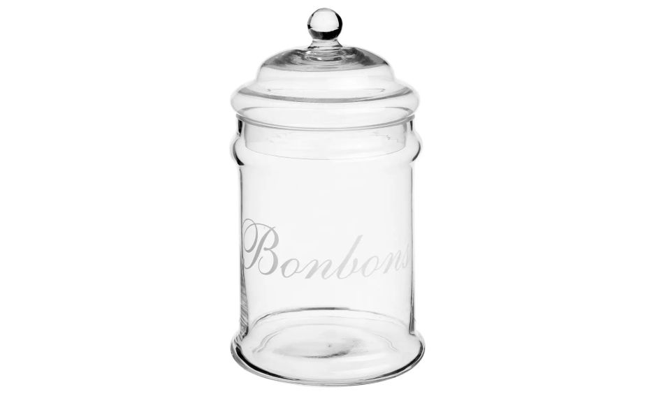 Staklenka s printom idealna je za spremanje slatkiša. Idealna za pohranu lomljivih keksi, vafli, čokolade itd. Natpis na staklenci(Bonbons) ukazuje da je i pogodna za spremanje bombona. Gornji poklopac s praktičnom ručkom štiti od vlage i isušivanja. Osim toga, estetski atraktivan dizajn svakako može poslužiti kao prekrasan ukras Vaše kuhinje i stola. Za vizualno atraktivnu cjelinu može se kombinirati s ostalim staklenkama sličnog dizajna.