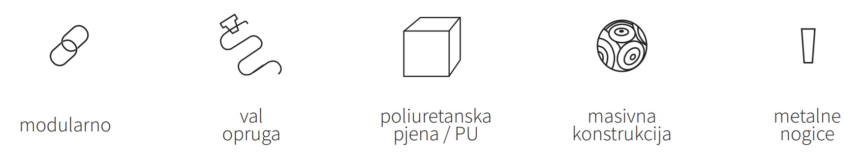 Svojim jednostavnim, ravnim linijama i naglašenim volumenom sjedišta unosi suvremen karakter u svaki prostor. Konstrukcija je izrađena od masivnog drva i kvalitetnih materijala, a sjedišta su punjena HR pjenom koja osigurava dugotrajnu udobnost.