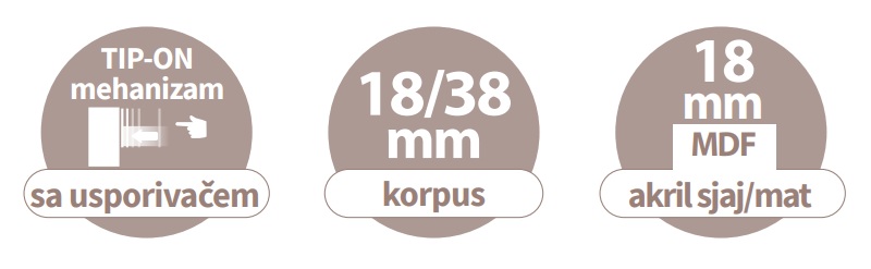 Karakteriziraju ga čiste, ravne linije bez vidljivih ručkica – otvaranje je riješeno preko diskretnog i funkcionalnog Tip-On sustava. Poseban estetski dojam ostavljaju dekorativne fronte dostupne u dvije sofisticirane varijante hrasta: Endgrain Classic i Cognac, koje prostoru daju prirodan, topao ugođaj unatoč suvremenoj formi.